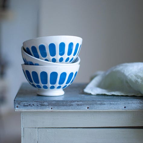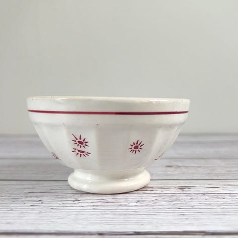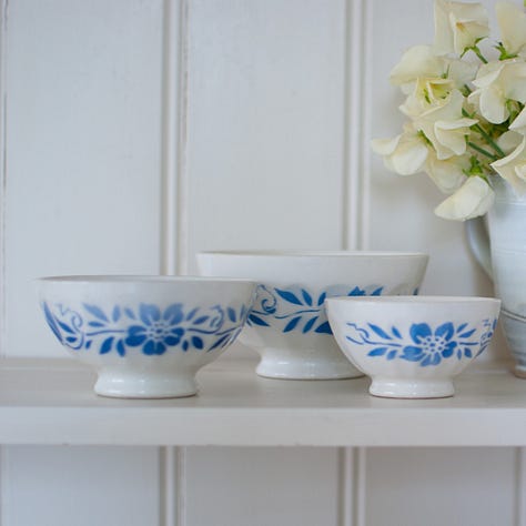 A tip if you are looking for a vintage cafe au lait bowl is to look for ones with a defined ‘foot’ (ie a distinct flaring out at the base rather than a gentle taper all the way down)- see photo. Bowls without a ‘foot’ are a much more modern design. Vintage bowls are usually made of china so if you find one that is more ‘chunky’ then it is probably a modern version too.