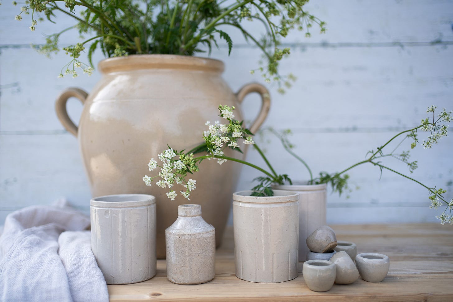 Confit pots are synonymous with country homes and extremely popular nowadays too. They can be used for anything from vases, utensil pots to umbrella stand. They come in a range of sizes, some with handles some without and are usually a beige/ neutral colour although some of the older ones have green or ochre glazing on the top.