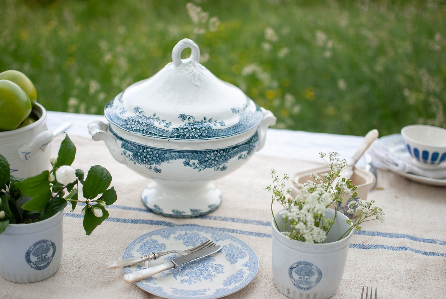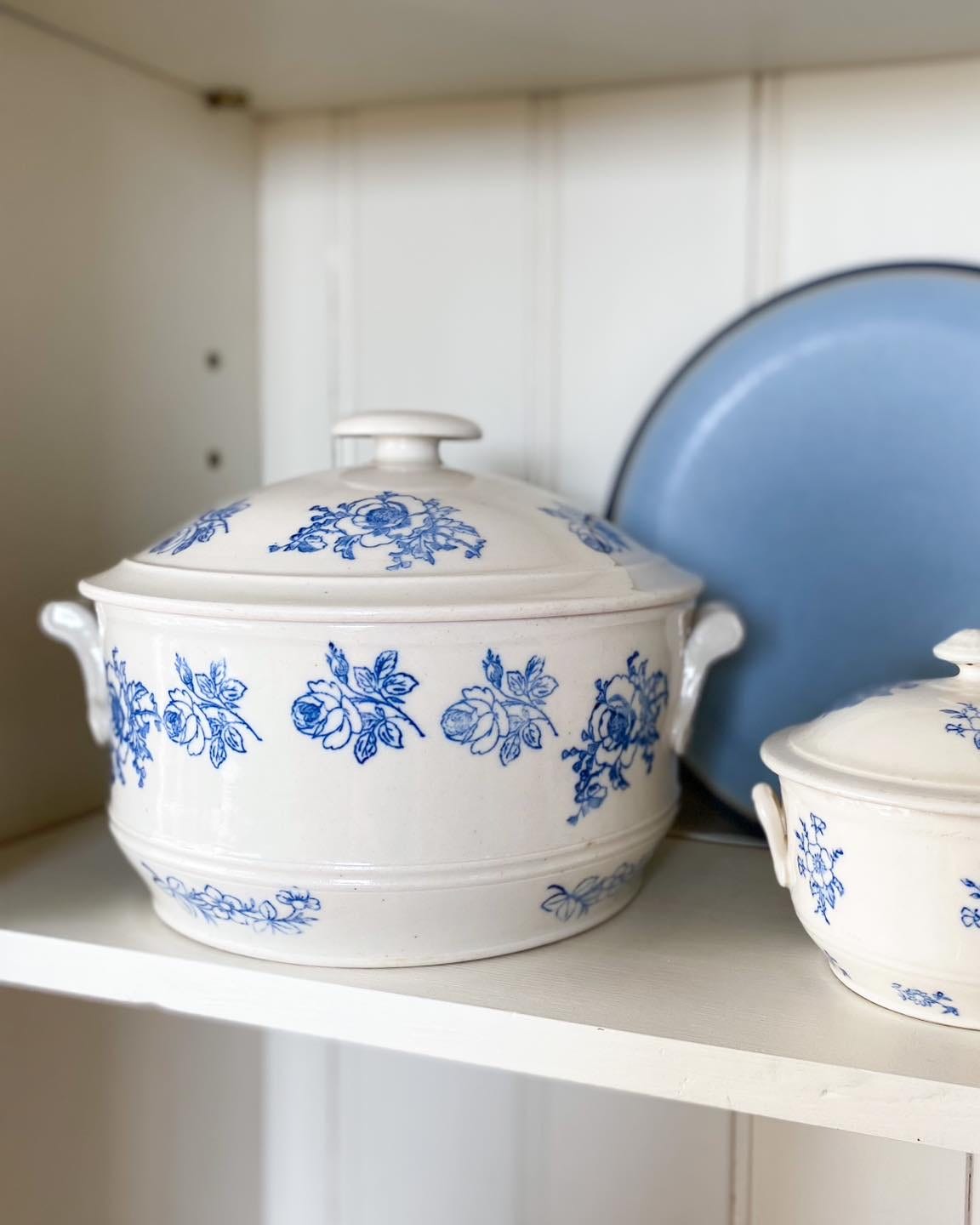 These are a type of tureen designed specifically to serve soup or sauces. There is usually a notch in the lid for a ladle to remain in it while the lid is on. Again, these come in all sorts of shapes and sizes and, while we don’t often serve soup like that anymore, they are very popular as display pieces on a dresser, as fruit bowls and particularly as planters for spring bulbs. Even if you are just serving strawberries in the garden the lid is rather handy for keeping the wasps and flies off.